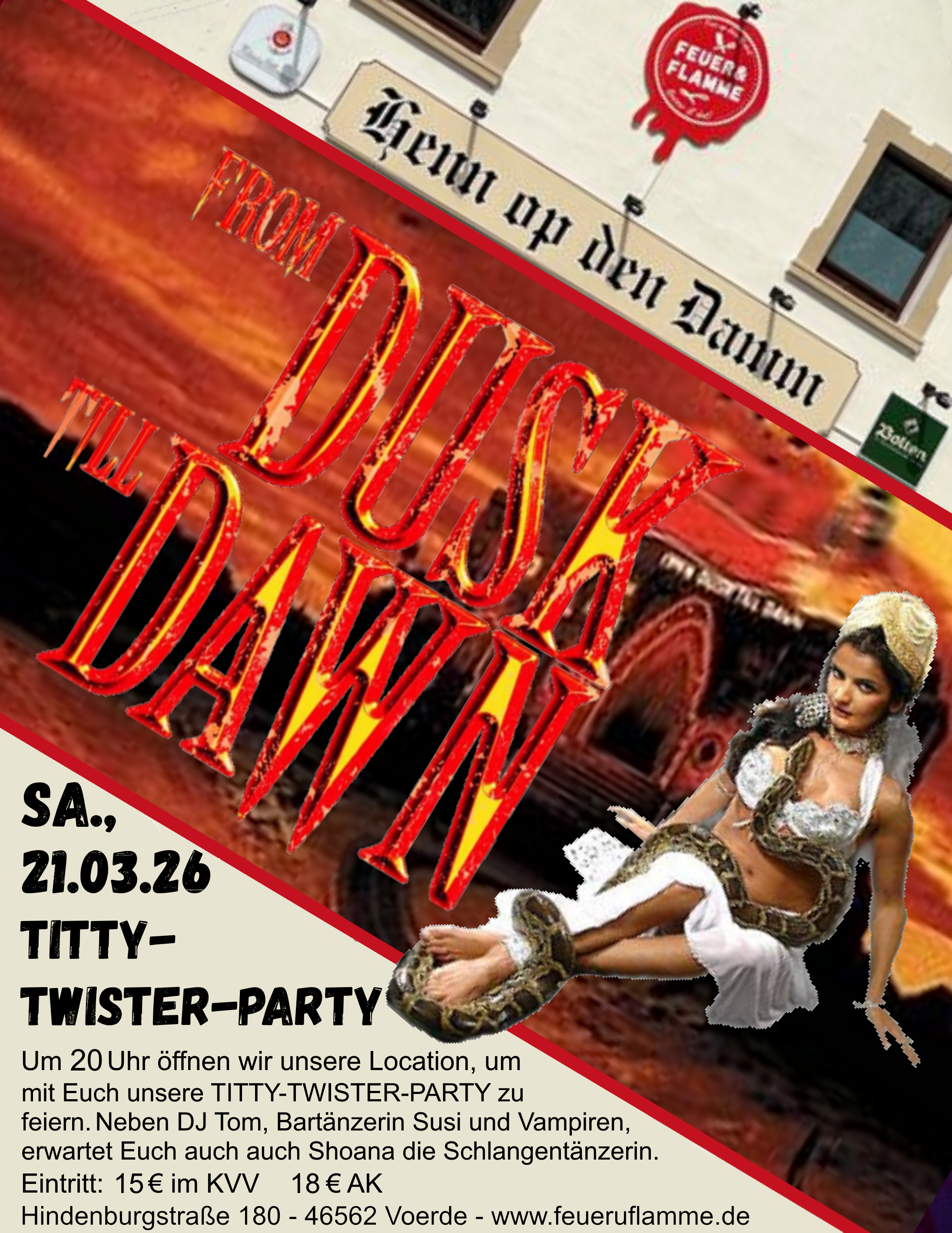 Am Samstag, 21.03.2026, steigt ab 20 Uhr im Feuer & Flamme, Voerde die legendäre „From Dusk Till Dawn“ Titty-Twister-Party mit DJ Tom, Bartänzerin Susi, Vampiren und Schlangentänzerin Shoana.